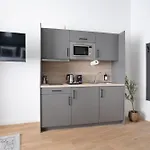 A microwave oven, a fridge, and a toaster are featured in a kitchen for your own cooking.